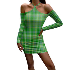 Dress features a cropped cut, off the shoulder detail with long sleeves, a halterneck, stretch and lined.It's a sexy women's dress