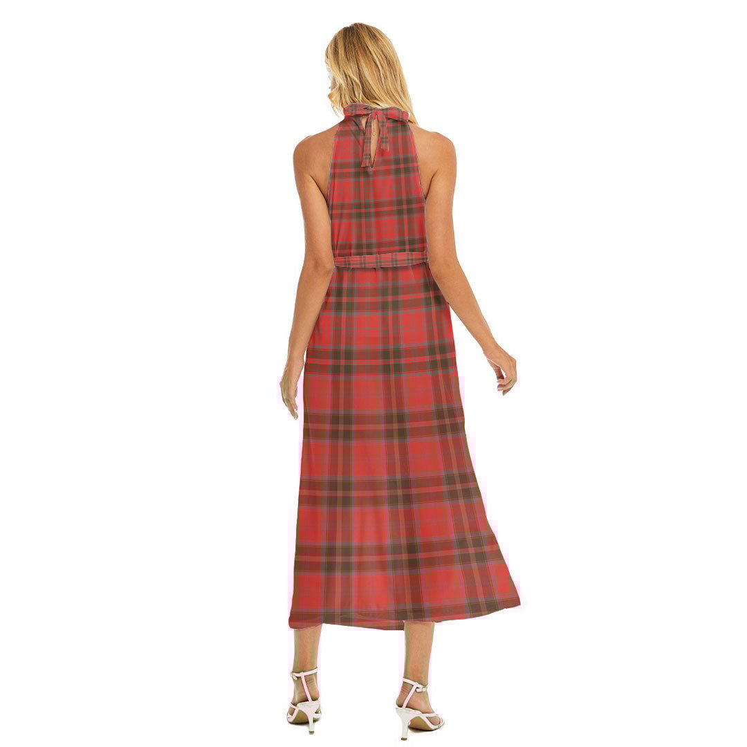 Grant Weathered Tartan Plaid Wrap Hem Belted Halter Dress