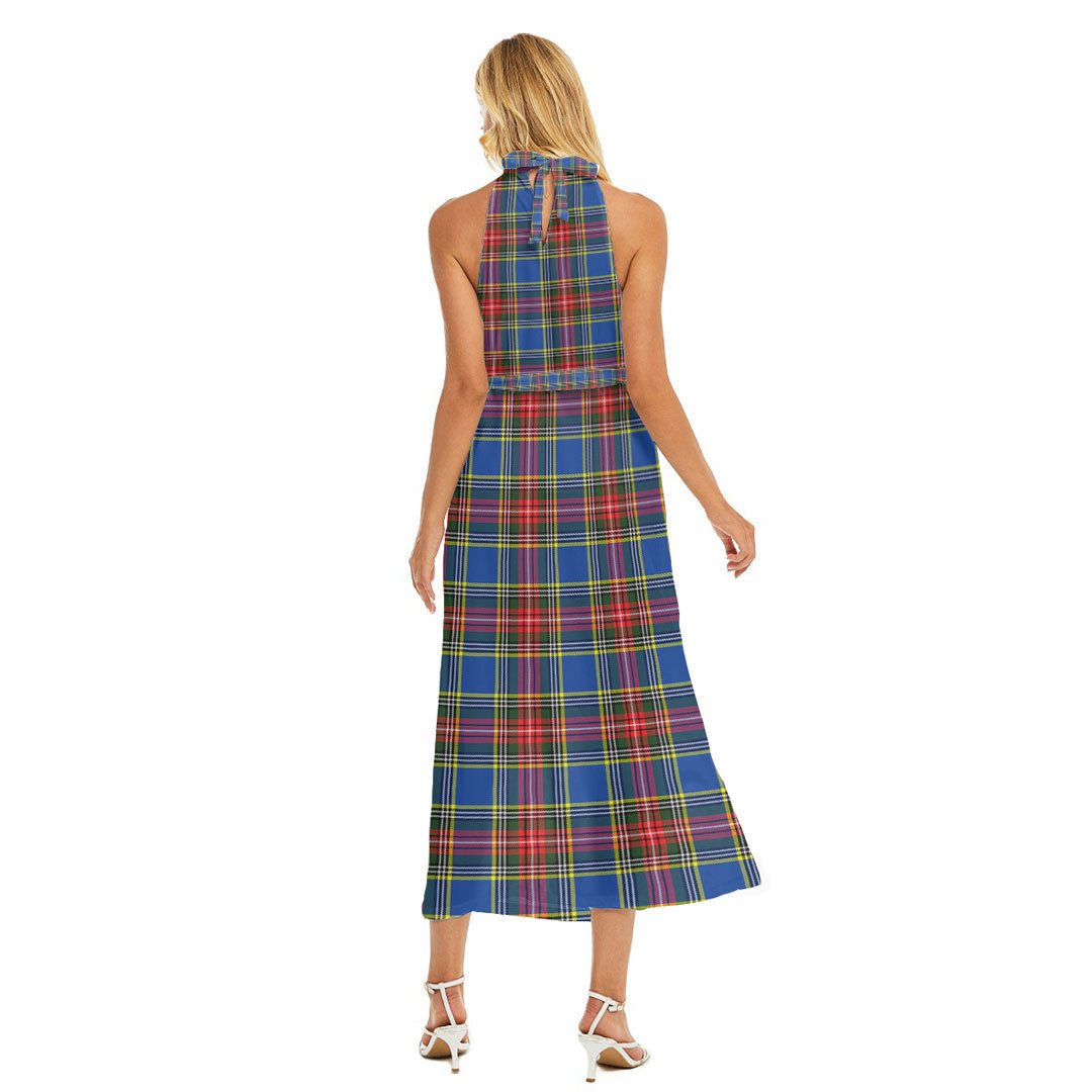 MacBeth Modern Tartan Plaid Wrap Hem Belted Halter Dress