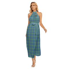 MacIntyre Hunting Ancient Tartan Crest Wrap Hem Belted Halter Dress