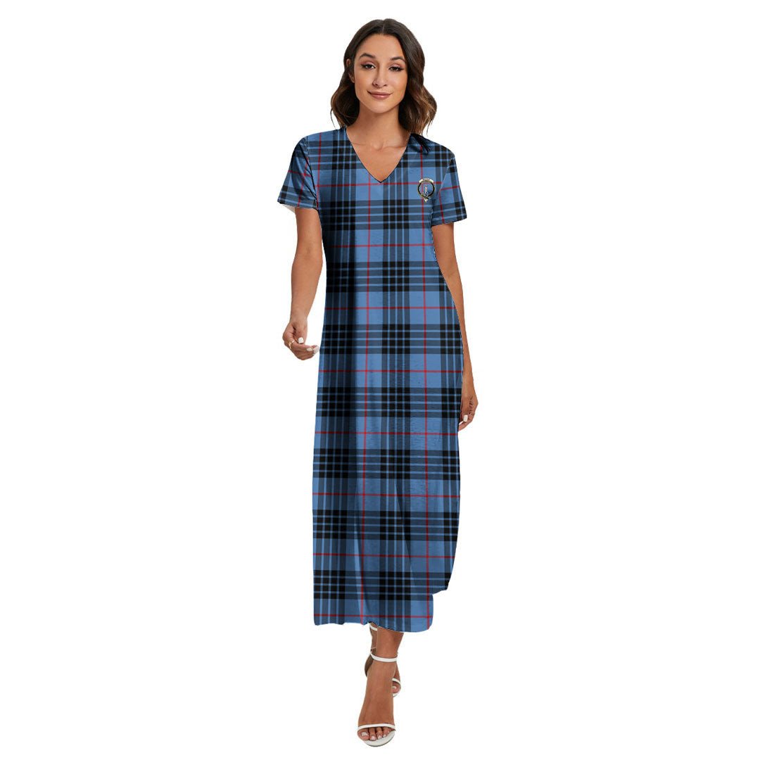 MacKay Blue Tartan Crest V-neck Dress Side Slit