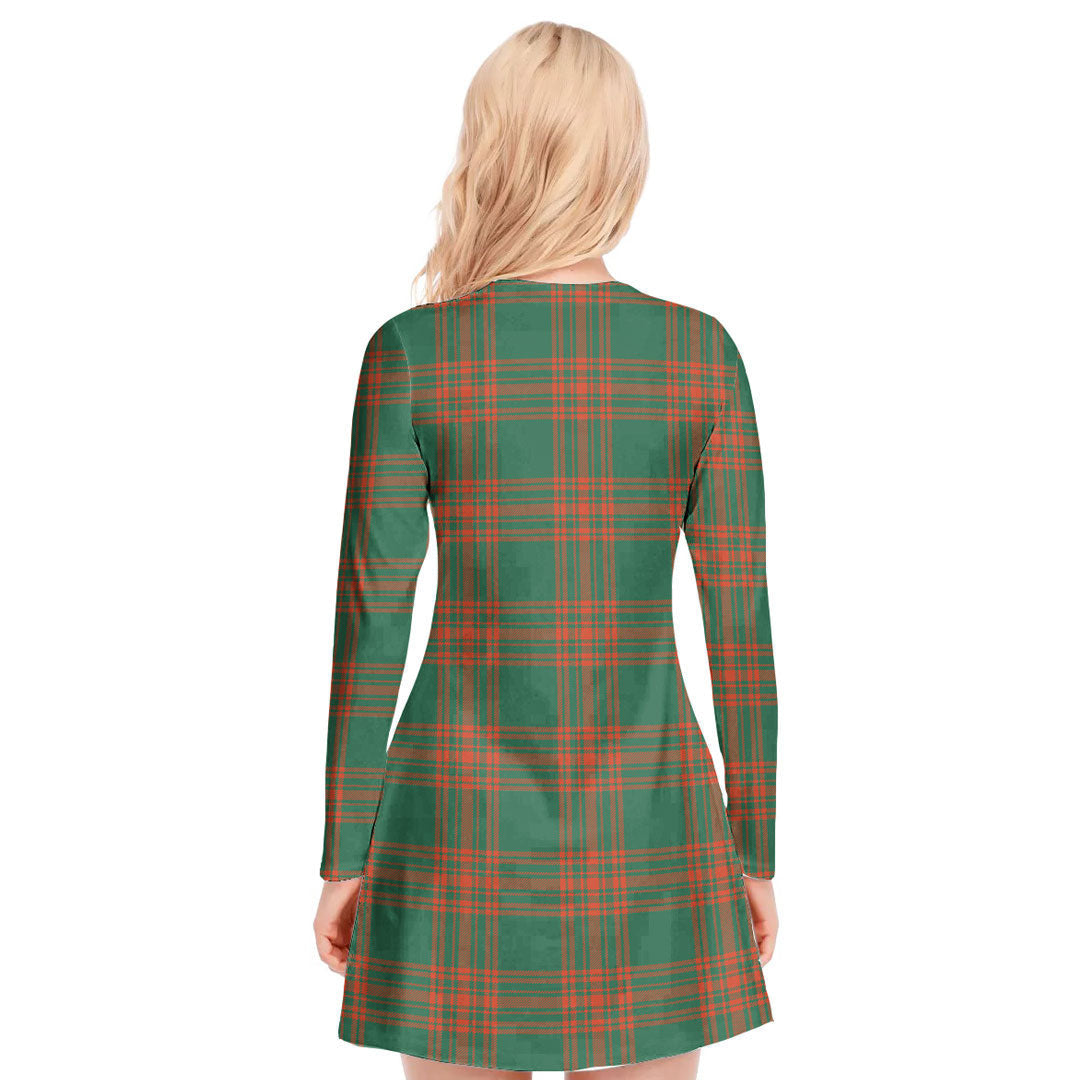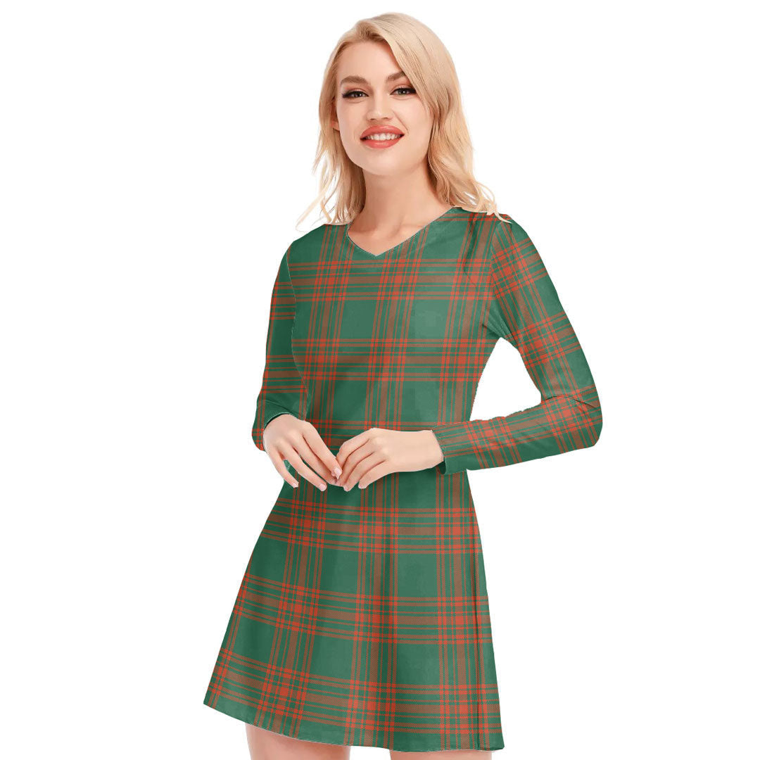 Menzies Green Ancient Tartan Plaid V-neck Long Sleeve Dress