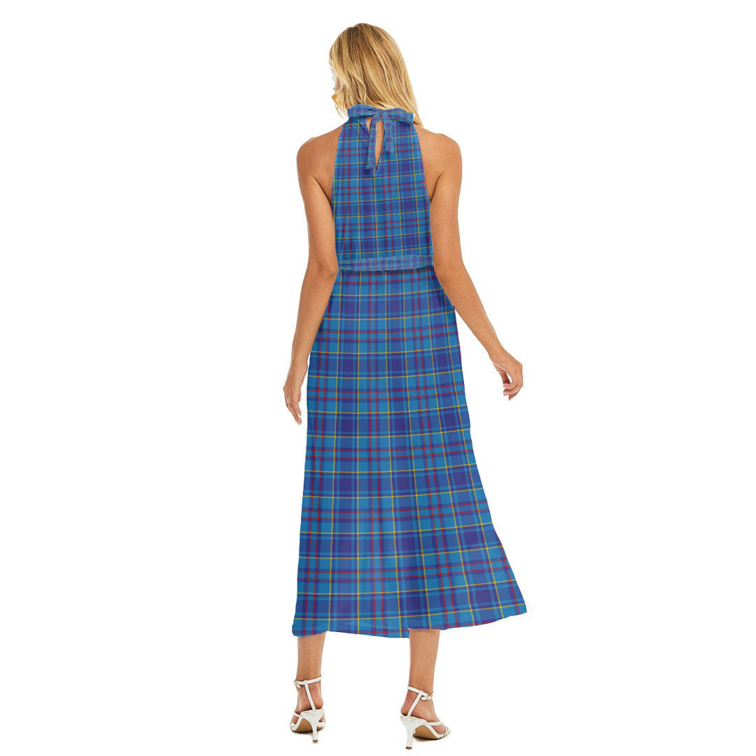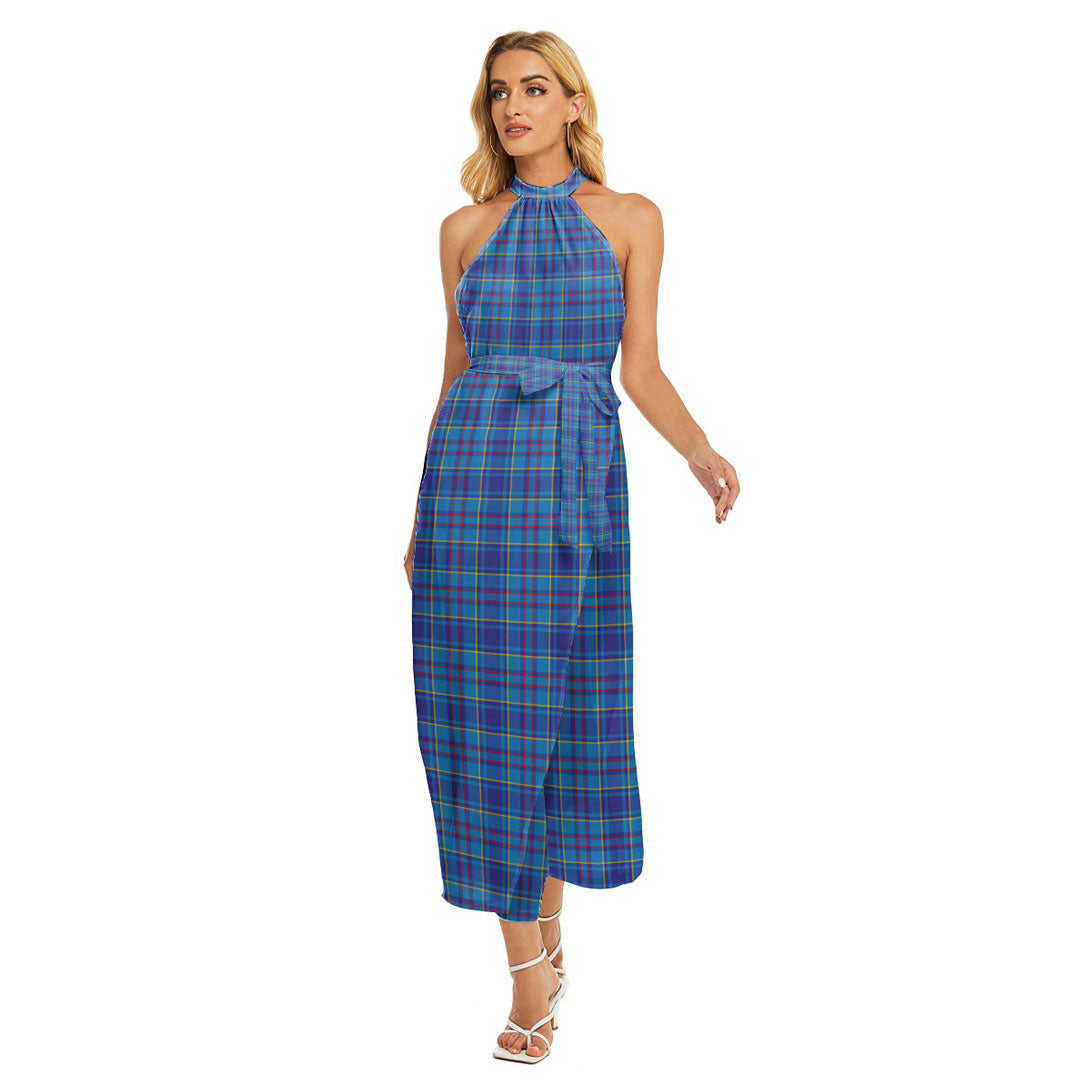 Mercer Modern Tartan Plaid Wrap Hem Belted Halter Dress