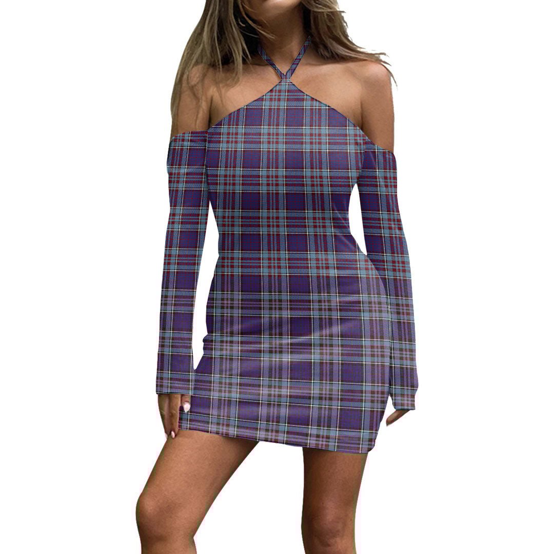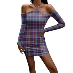 Dress features a cropped cut, off the shoulder detail with long sleeves, a halterneck, stretch and lined.It's a sexy women's dress