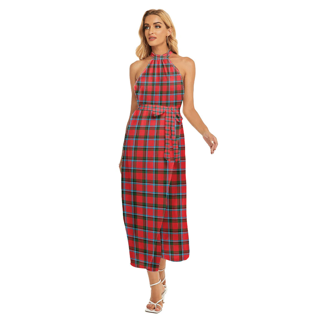 Sinclair Modern Tartan Plaid Wrap Hem Belted Halter Dress