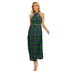 Stewart Old Modern Tartan Crest Wrap Hem Belted Halter Dress